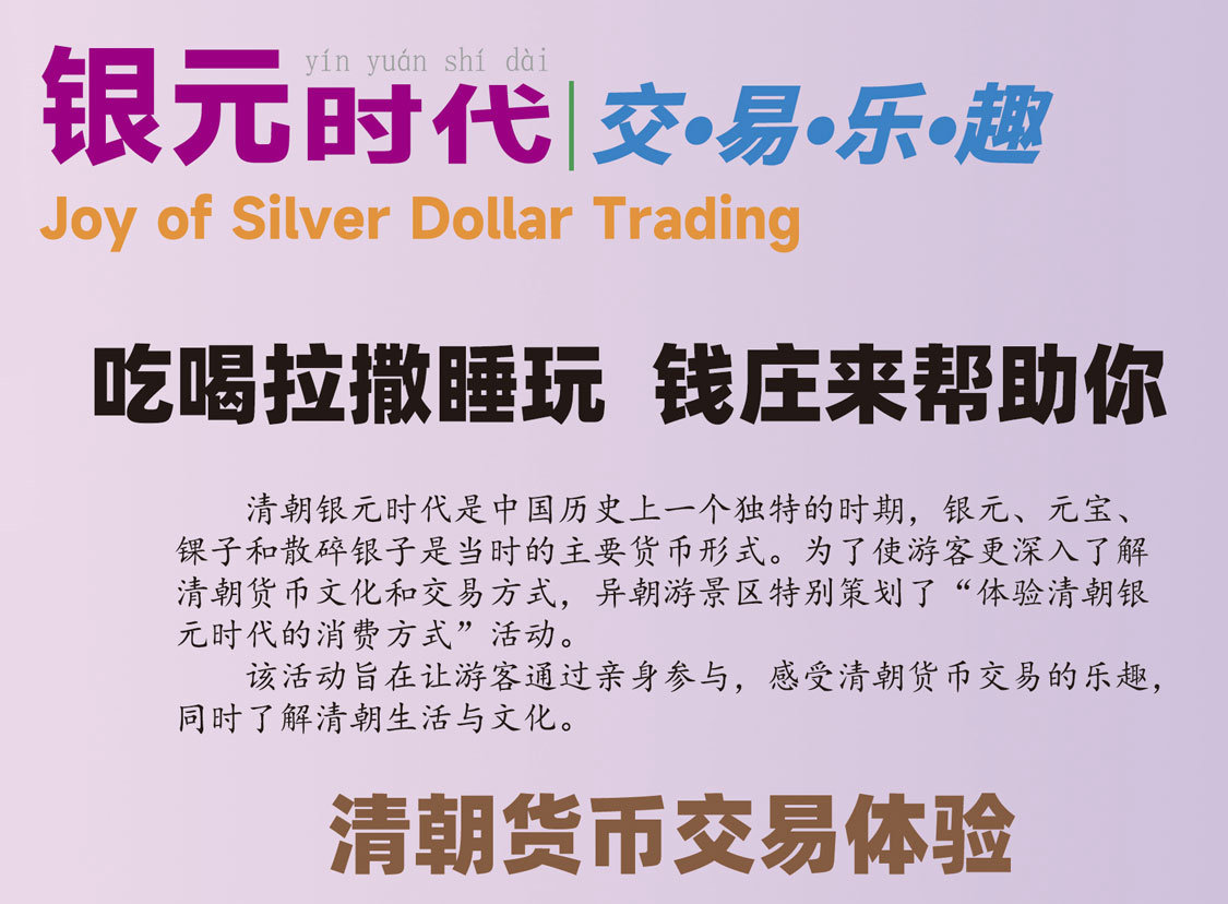 在当前的旅游市场中,游客对于体验的需求不断升级,他们不再满足于仅仅作为观察者,而是希望深入参与到旅游目的地的文化、历史和社会生活中去。异朝游超沉浸式旅游是一种全新的旅游方式,它通过全景式的视、触、听觉交互体验,让游客进入到“超沉体验模式”,真正感受到身临其境的感觉。借助这种旅游方式,游客可以更加深入地了解不同朝代的历史和文化,获得更加逼真和生动的体验。本文将从人人徜徉在银票、当票和银元时代,去体验清朝消费的角度出发,探讨国内景区融合异朝游项目的优势。